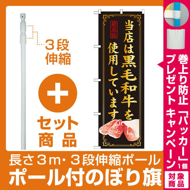【セット商品】3m・3段伸縮のぼりポール(竿)付 のぼり旗 黒毛和牛 (SNB-4420) [プレゼント付](セール・イベント・催事/精肉・肉の日)